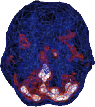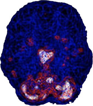 SPECT (single photon emission computed tomography) is a nuclear medicine study that evaluates blood flow and activity in the brain. Basically, it shows three things: healthy activity, too little activity, or too much activity. A healthy “active” scan shows the most active parts of the brain with blue representing the average activity and red (or sometimes red and white) representing the most active parts of the brain. In the healthy scan on the top right, the most active area is in the cerebellum, at the back/bottom part of the brain. In the brain scan below it of a woman with postpartum depression, there is excessive activity in the deep limbic system—the brain’s emotional center.